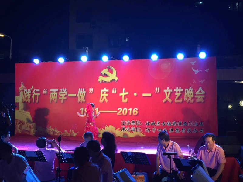 為紀念中國共產黨成立95周年,進一步激發(fā)基層黨組織活力,促進和諧社企建設,展示社區(qū)濃厚的文化氛圍和企業(yè)關愛民生的責任擔當,由任城區(qū)古槐街道西門社區(qū)主辦,濟寧四和供熱有限公司承辦的“踐行‘兩學一做’慶‘七·一’”主題文藝晚會在光明健身廣場隆重舉行,四和供熱公司演職人員同廣大黨員群眾一起載歌載舞共迎黨的生日。